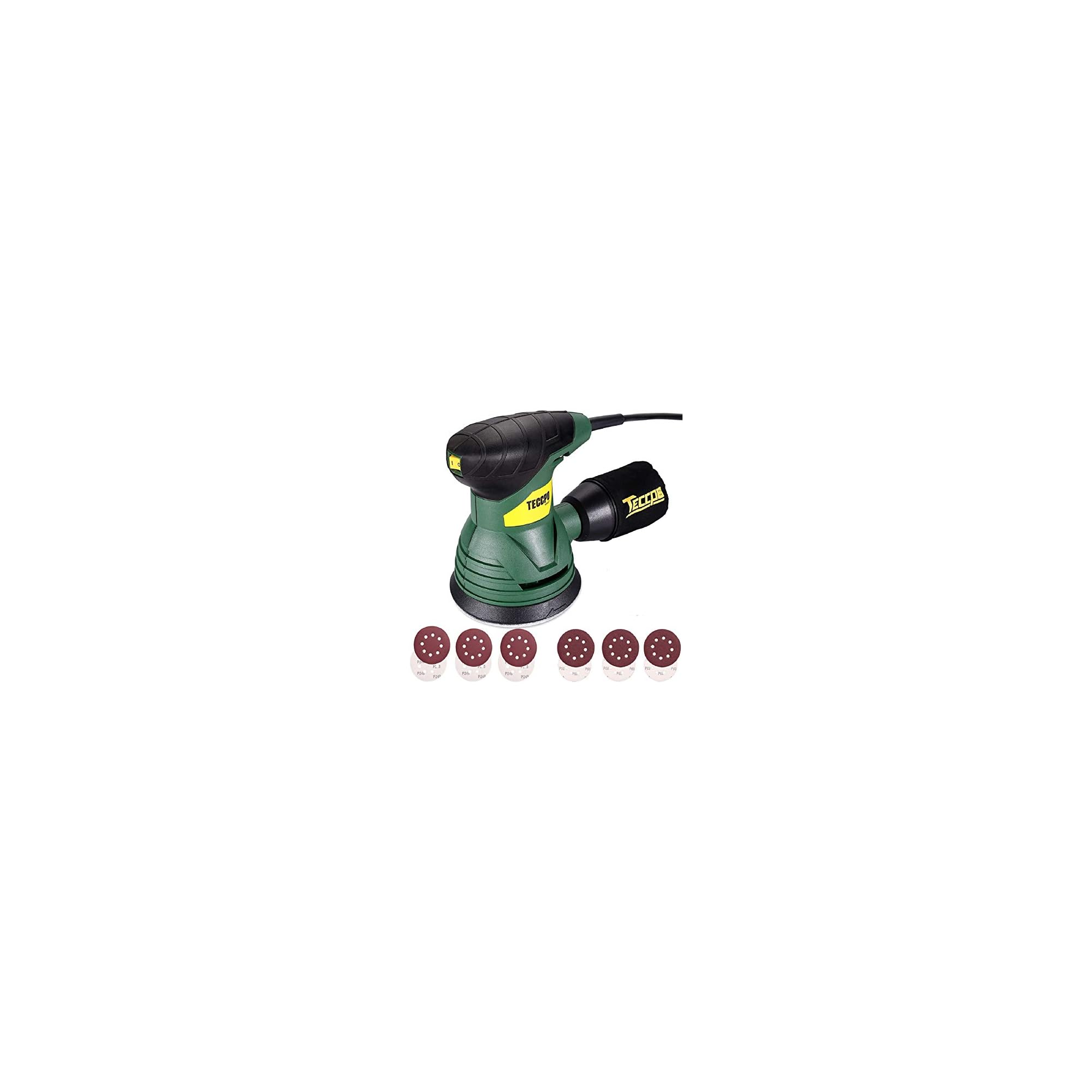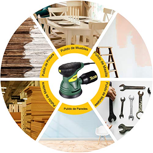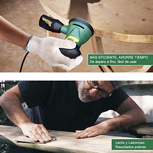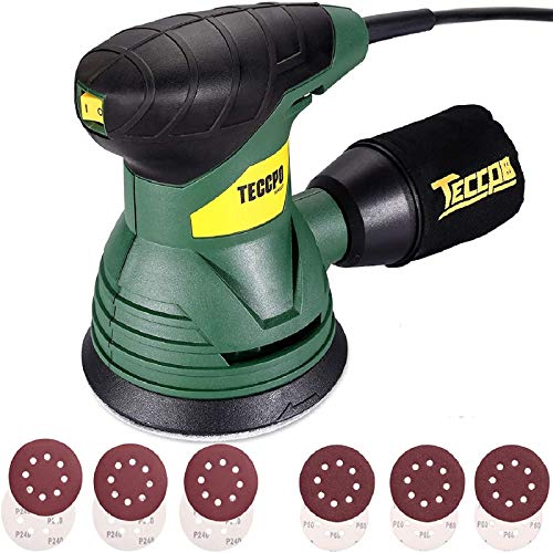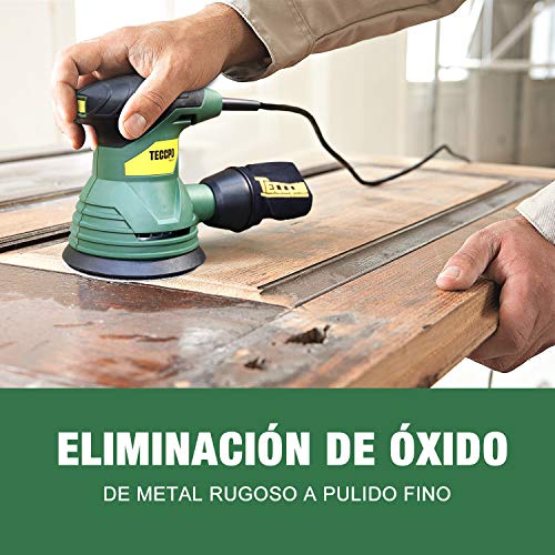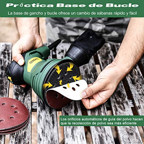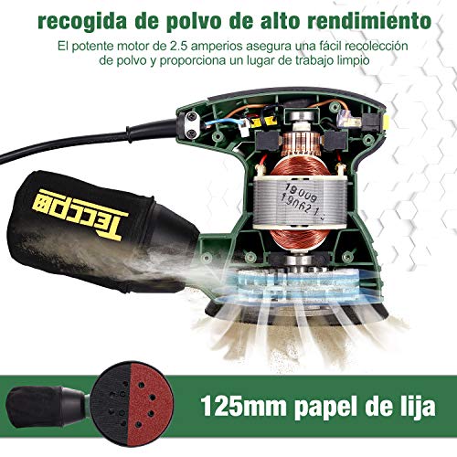Lijadora Orbital, TECCPO Lijadora Eléctrica 350W, Motor de Cobre, Lijadora Excéntrica de 14000OPM, 12 Papeles de Lija (6 x80/180 granos), Bolsillo Lavable, para Pulir Madera y Quitar Pintura-TARS22P