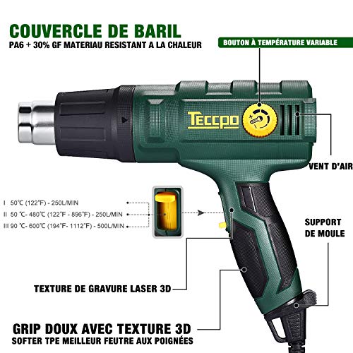 Pistola de aire caliente TECCPO 2000W, 50-650 ℃ alta potencia, 8 accesorios de boquilla, calentamiento rápido en segundos (tiempo de trabajo superior a 500 horas) – TAHG08P