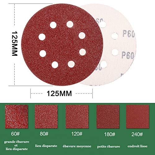 TecCPO – Disco de lijado (120 unidades, papel de lija para lijadora excéntrica, diámetro 125 mm, discos abrasivos de 24 x (P60/80/120/180/240)