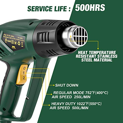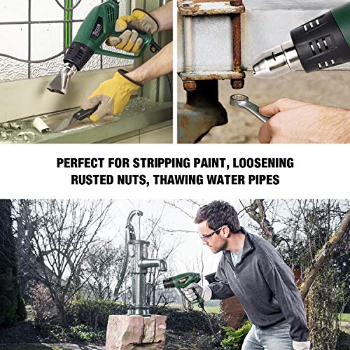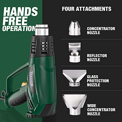 7 accesorios adjuntos: con boquilla concentrada, boquilla de protección de vidrio, boquilla ancha concentrada, boquilla reflectora, raspador y raspador detallado, la pistola térmica puede manejar fácilmente todo tipo de escenarios como barbacoas, eliminación de pintura, reparación de teléfonos inteligentes, artes y manualidades, reparaciones, etc.