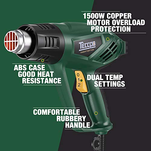 ① Motor potente – El motor de 2000 W hace que la pistola térmica Tecpo sea un 150% más eficiente que la pistola térmica normal. La pistola de aire caliente puede calentarse hasta 550 ℃ en cuestión de segundos. Elige entre 2 modos: 0 (OFF), 2 – 400 ℃(250 L/min), Ⅱ – 550 ℃(500 L/min).