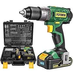 Taladro Atornillador 18V, POPOMAN Taladro Percutor a Batería, 105PCS accesorios, 2 Baterías 2.0Ah, 2 Velociadades ajustables, Par 45N.m, 21+3 Ajuste de par, con Cargador, Caja Compacta-BHD700B
